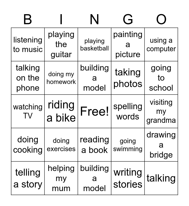 This bingo card has a free space and 24 words: doing exercises, helping my mum, building a model, telling a story, using a computer, listening to music, talking on the phone, playing the guitar, spelling words, reading a book, taking photos, watching TV, going swimming, drawing a bridge, doing my homework, writing stories, visiting my grandma, playing basketball, going to school, riding a bike, talking, doing cooking, painting a picture and building a model.