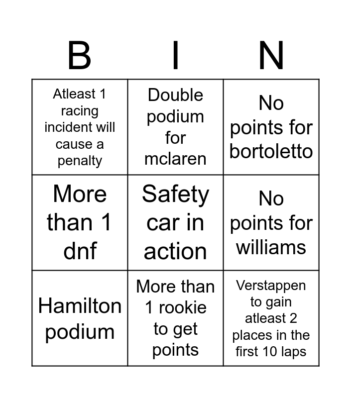This bingo card has a free space and 8 words: No points for williams, No points for bortoletto, Double podium for mclaren, Hamilton podium, Atleast 1 racing incident will cause a penalty, Verstappen to gain atleast 2 places in the first 10 laps, More than 1 dnf and More than 1 rookie to get points.