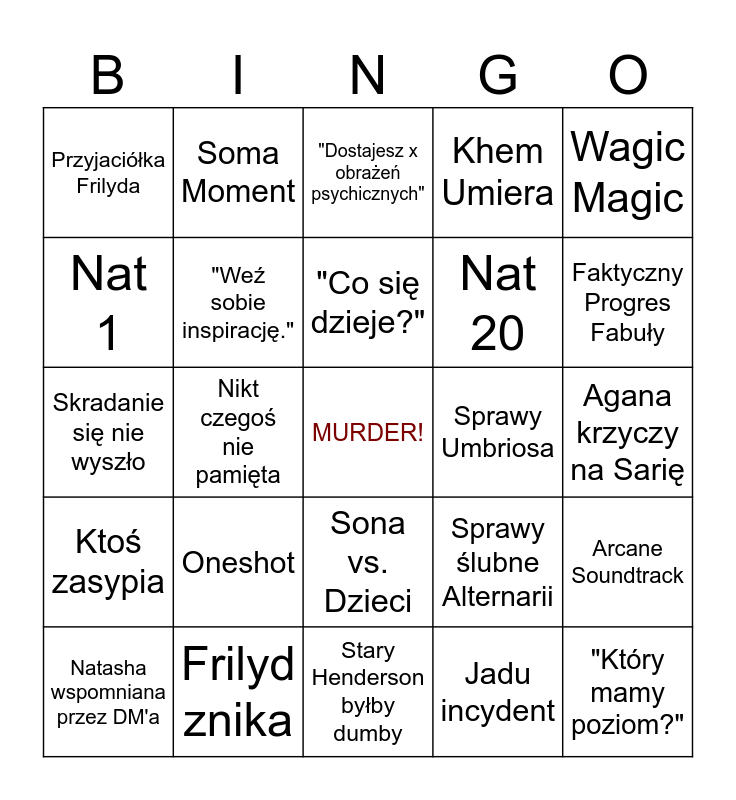 This bingo card has a free space and 24 words: Oneshot, Frilyd znika, "Co się dzieje?", Natasha wspomniana przez DM'a, Wagic Magic, Przyjaciółka Frilyda, Nat 1, Soma Moment, Sprawy Umbriosa, Sona vs. Dzieci, Nat 20, Skradanie się nie wyszło, Sprawy ślubne Alternarii, Arcane Soundtrack, "Weź sobie inspirację.", Jadu incydent, Agana krzyczy na Sarię, "Dostajesz x obrażeń psychicznych", Faktyczny Progres Fabuły, Nikt czegoś nie pamięta, "Który mamy poziom?", Ktoś zasypia, Khem Umiera and Stary Henderson byłby dumby.