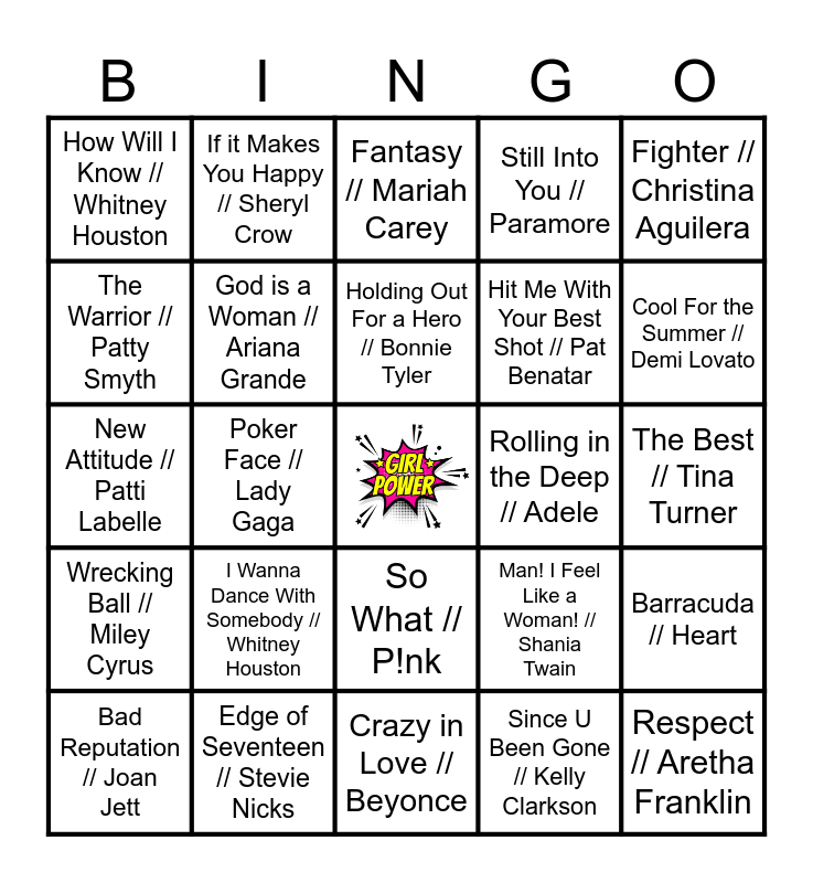 This bingo card has a free space and 31 words: Crazy in Love // Beyonce, My Life Would Suck Without You // Kelly Clarkson, Poker Face // Lady Gaga, Too Little Too Late // Jojo, How Will I Know // Whitney Houston, Fantasy // Mariah Carey, God is a Woman // Ariana Grande, Man! I Feel Like a Woman! // Shania Twain, Rolling in the Deep // Adele, Since U Been Gone // Kelly Clarkson, The Best // Tina Turner, Respect // Aretha Franklin, My Heart Will Go On // Celine Dion, If I Were a Boy // Beyonce, Cool For the Summer // Demi Lovato, I’m Every Woman // Chaka Khan, Barracuda // Heart, I Wanna Dance With Somebody // Whitney Houston, Wrecking Ball // Miley Cyrus, So What // P!nk, Fighter // Christina Aguilera, Zombie // The Cranberries, Bad Reputation // Joan Jett, If it Makes You Happy // Sheryl Crow, Hit Me With Your Best Shot // Pat Benatar, The Warrior // Patty Smyth, Still Into You // Paramore, New Attitude // Patti Labelle, Edge of Seventeen // Stevie Nicks, Holding Out For a Hero // Bonnie Tyler and Love Song // Sara Bareilles.