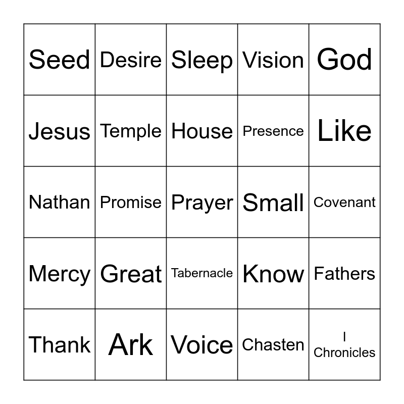 This bingo card has 40 words: David, Nathan, Solomon, Temple, Ark, Tabernacle, House, Lord, God, Mercy, Promise, Vision, Prayer, Covenant, Small, Great, Build, Seed, Kingdom, Sleep, Fathers, Chasten, Presence, Jesus, Appreciate, War, Blood, Night, I Chronicles, I Kings, II Samuel, Thank, Things, Know, Like, Voice, Ears, Temple Inside, Desire and Turned.