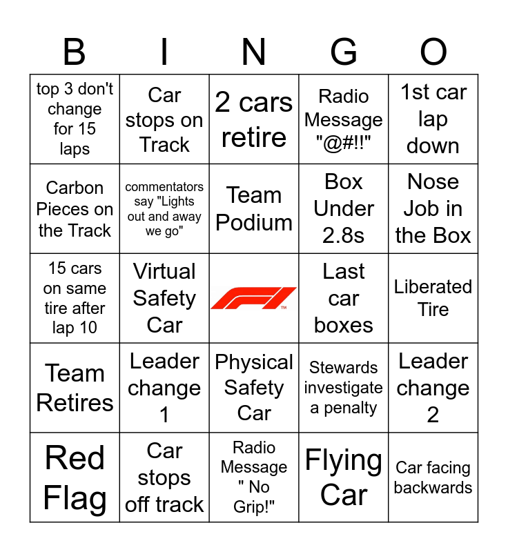 This bingo card has a free space and 33 words: 1st car retires, 6 Teams in top 10, Virtual Safety Car, Bad pit over 4 sec., Team Retires, commentators say "Lights out and away we go", 1st car lap down, Red Flag, Car stops on Track, 1st Car in the Box, Team Podium, 2 cars retire, Rookie Passes Rookie on Track, Red Bull Cheating, Last car boxes, Nose Job in the Box, Car stops off track, 15 cars on same tire after lap 10, Leader change 1, Stewards investigate a penalty, Physical Safety Car, Yellow Flag, top 3 don't change for 15 laps, Liberated Tire, Radio Message " No Grip!", Car facing backwards, Radio Message "@#!!", Box Under 2.8s, Carbon Pieces on the Track, Leader change 2, Kids in View, Flying Car and Tire Lock up after lap 2.