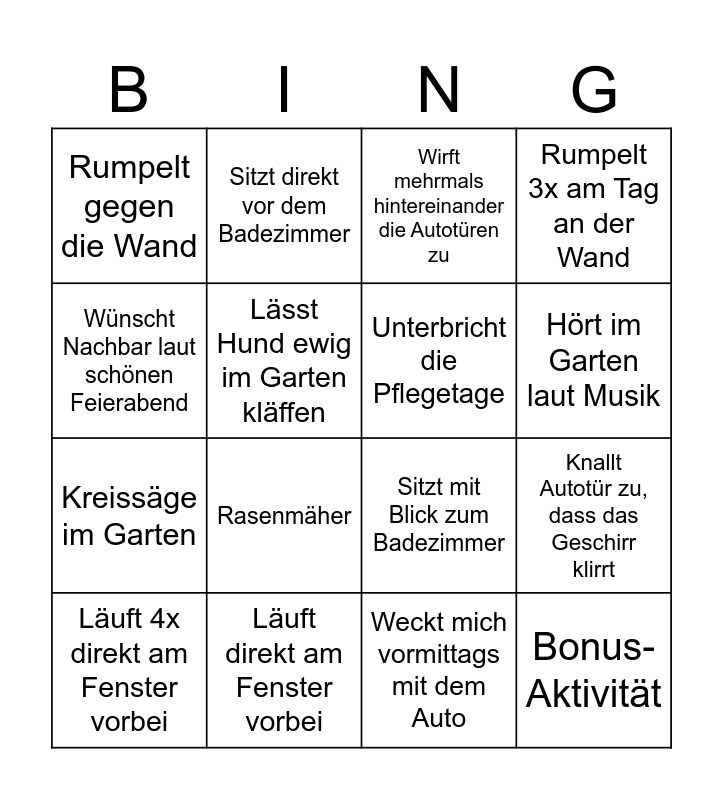 This bingo card has 16 words: Läuft direkt am Fenster vorbei, Knallt Autotür zu, dass das Geschirr klirrt, Wirft mehrmals hintereinander die Autotüren zu, Rumpelt gegen die Wand, Kreissäge im Garten, Sitzt direkt vor dem Badezimmer, Sitzt mit Blick zum Badezimmer, Weckt mich vormittags mit dem Auto, Wünscht Nachbar laut schönen Feierabend, Lässt Hund ewig im Garten kläffen, Läuft 4x direkt am Fenster vorbei, Rumpelt 3x am Tag an der Wand, Rasenmäher, Hört im Garten laut Musik, Unterbricht die Pflegetage and Bonus-Aktivität.