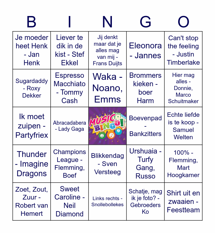 This bingo card has a free space and 34 words: Another love - Tom Odell, Ladada - Claude, Noodgeval - Goldband, Tattoo - Loreen, Echte liefde is te koop - Samuel Welten, Sugardaddy - Roxy Dekker, Espresso Macchiato - Tommy Cash, Links rechts - Snollebollekes, Brommers kieken - boer Harm, Shirt uit en zwaaien - Feestteam, Ik moet zuipen - Partyfriex, Liever te dik in de kist - Stef Ekkel, Schatje, mag ik je foto? - Gebroeders Ko, Leef - Hazes jr., Thunder - Imagine Dragons, Abracadabera - Lady Gaga, Blikkendag - Sven Versteeg, Boevenpad - Bankzitters, 100% - Flemming, Mart Hoogkamer, Zoet, Zout, Zuur - Robert van Hemert, Sweet Caroline - Neil Diamond, Wackelkontakt - Oimara, Eleonora - Jannes, Hier mag alles - Donnie, Marco Schuitmaker, Thank you (nog so bad) - Dimitri Vegas & Like Mike, Champions League - Flemming, Boef, Jij denkt maar dat je alles mag van mij - Frans Duijts, Wat wil je van mij - Metejoor & Hannah Mae, Can't stop the feeling - Justin Timberlake, Je moeder heet Henk - Jan Henk, Koekje met je moeder - Kalvijn, Guy, Waka - Noano, Emms, Urshuaia - Turfy Gang, Russo and Mijn huis - Kraantje Pappie, Ronnie Flex.