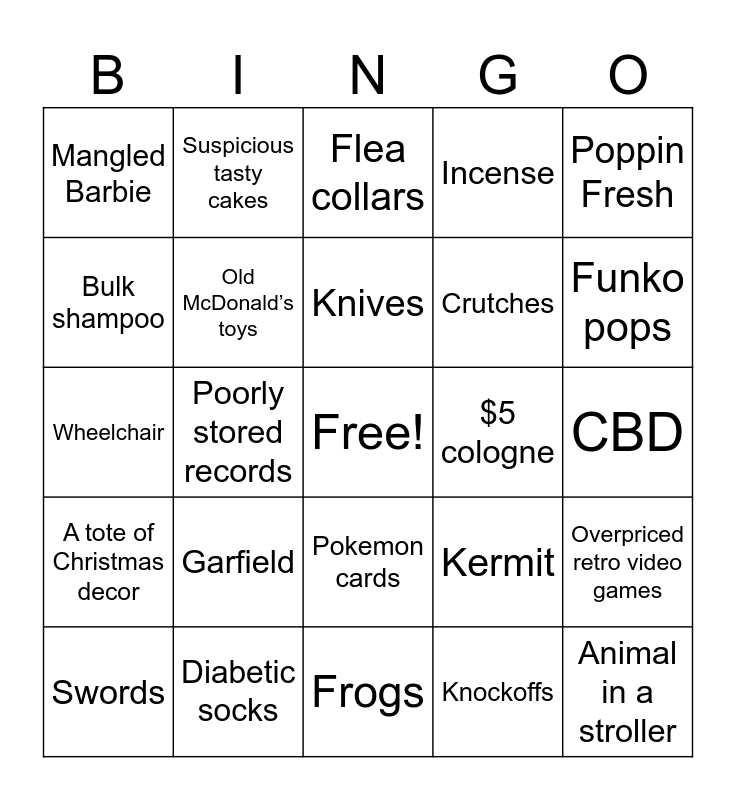 This bingo card has a free space and 24 words: Garfield, Diabetic socks, Knives, Swords, Poppin Fresh, Mangled Barbie, Bulk shampoo, Suspicious tasty cakes, $5 cologne, Pokemon cards, Crutches, Wheelchair, Kermit, Overpriced retro video games, Old McDonald’s toys, Knockoffs, CBD, Flea collars, Funko pops, Poorly stored records, Animal in a stroller, A tote of Christmas decor, Incense and Frogs.