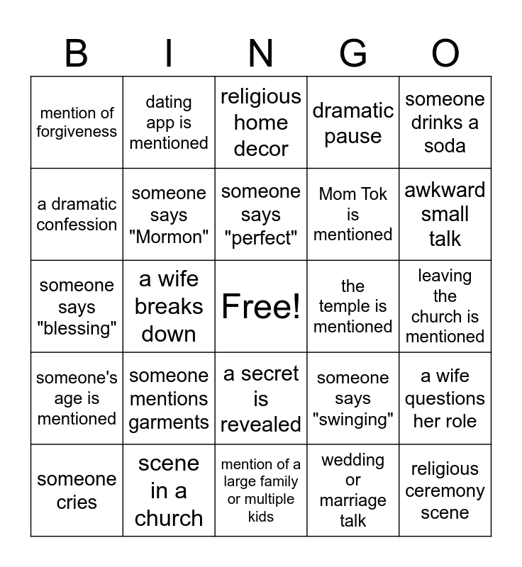 This bingo card has a free space and 24 words: someone mentions garments, scene in a church, someone says "perfect", someone cries, someone drinks a soda, mention of forgiveness, a dramatic confession, dating app is mentioned, the temple is mentioned, a secret is revealed, Mom Tok is mentioned, someone says "blessing", someone says "swinging", a wife questions her role, someone says "Mormon", wedding or marriage talk, leaving the church is mentioned, religious home decor, awkward small talk, a wife breaks down, religious ceremony scene, someone's age is mentioned, dramatic pause and mention of a large family or multiple kids.