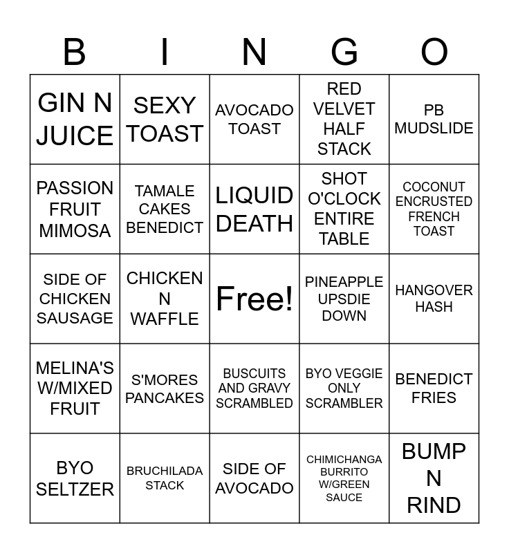 This bingo card has a free space and 24 words: S'MORES PANCAKES, BRUCHILADA STACK, LIQUID DEATH, BYO SELTZER, PB MUDSLIDE, GIN N JUICE, PASSION FRUIT MIMOSA, SEXY TOAST, PINEAPPLE UPSDIE DOWN, BUSCUITS AND GRAVY SCRAMBLED, SHOT O'CLOCK ENTIRE TABLE, SIDE OF CHICKEN SAUSAGE, BYO VEGGIE ONLY SCRAMBLER, BENEDICT FRIES, TAMALE CAKES BENEDICT, CHIMICHANGA BURRITO W/GREEN SAUCE, HANGOVER HASH, AVOCADO TOAST, COCONUT ENCRUSTED FRENCH TOAST, CHICKEN N WAFFLE, BUMP N RIND, MELINA'S W/MIXED FRUIT, RED VELVET HALF STACK and SIDE OF AVOCADO.