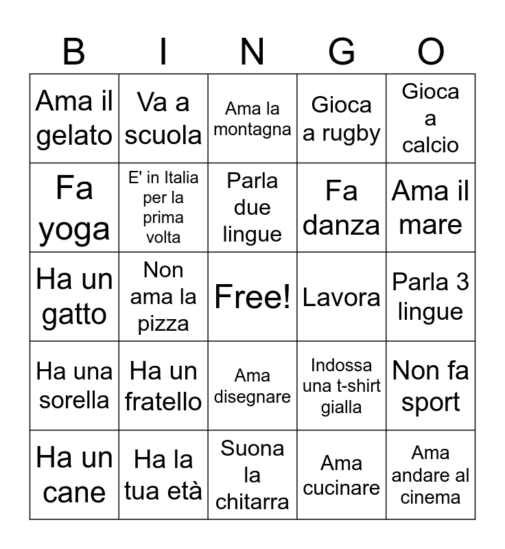 This bingo card has a free space and 24 words: Ha un fratello, Ha la tua età, Parla due lingue, Ha un cane, Gioca a calcio, Ama il gelato, Fa yoga, Va a scuola, Lavora, Ama disegnare, Fa danza, Ha un gatto, Indossa una t-shirt gialla, Non fa sport, E' in Italia per la prima volta, Ama cucinare, Parla 3 lingue, Ama la montagna, Ama il mare, Non ama la pizza, Ama andare al cinema, Ha una sorella, Gioca a rugby and Suona la chitarra.