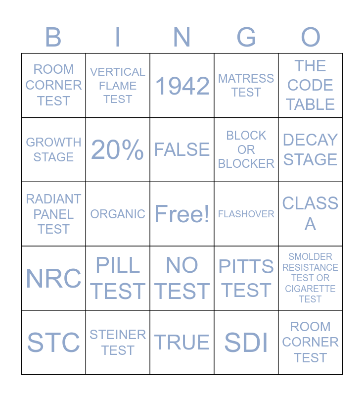 This bingo card has a free space and 24 words: PILL TEST, STEINER TEST, FALSE, STC, THE CODE TABLE, ROOM CORNER TEST, GROWTH STAGE, VERTICAL FLAME TEST, FLASHOVER, NO TEST, BLOCK OR BLOCKER, RADIANT PANEL TEST, PITTS TEST, SMOLDER RESISTANCE TEST OR CIGARETTE TEST, 20%, SDI, CLASS A, 1942, DECAY STAGE, ORGANIC, ROOM CORNER TEST, NRC, MATRESS TEST and TRUE.