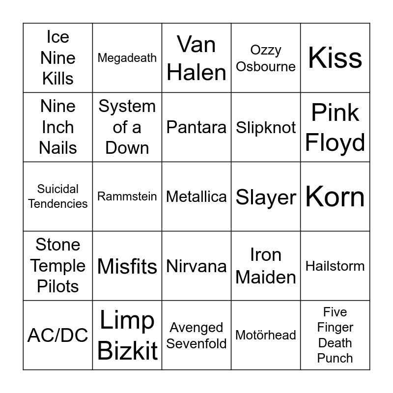 This bingo card has a free space and 24 words: Misfits, Limp Bizkit, Pantara, AC/DC, Kiss, Ice Nine Kills, Nine Inch Nails, Megadeath, Slayer, Nirvana, Slipknot, Suicidal Tendencies, Iron Maiden, Hailstorm, System of a Down, Motörhead, Korn, Van Halen, Pink Floyd, Rammstein, Five Finger Death Punch, Stone Temple Pilots, Ozzy Osbourne and Avenged Sevenfold.