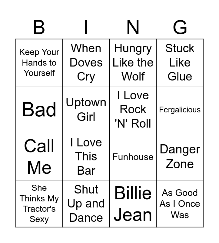 This bingo card has 27 words: Can't Fight The Moonlight, Material Girl, Call Me, Ain't No Love In Oklahoma, Uptown Girl, Hungry Like the Wolf, When Doves Cry, As Good As I Once Was, Shut Up and Dance, Rockstar, Funhouse, Stuck Like Glue, Raise Your Glass, Pour Some Sugar On Me, I Love This Bar, Before He Cheats, I Love Rock 'N' Roll, Fergalicious, One Way or Another, Keep Your Hands to Yourself, Billie Jean, Sweet Home Alabama, Danger Zone, She Thinks My Tractor's Sexy, So What, Bad and Life is a Highway.