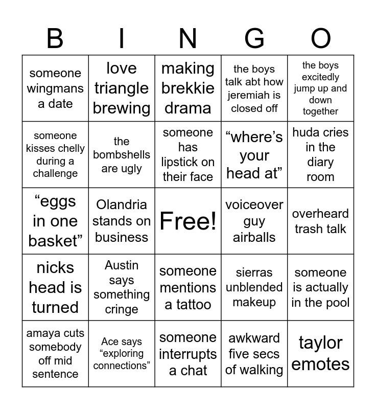 This bingo card has a free space and 30 words: Ace says “exploring connections”, Huda contradicts herself, Olandria stands on business, somebody cries, someone wingmans a date, making brekkie drama, the bombshells are ugly, someone mentions a tattoo, voiceover guy airballs, someone interrupts a chat, overheard trash talk, taylor emotes, awkward five secs of walking, charlie wears a backwards hat, huda cries in the diary room, someone makes out in soul ties, sierras unblended makeup, nicks head is turned, Austin says something cringe, the boys excitedly jump up and down together, “eggs in one basket”, “stepping on toes”, love triangle brewing, “where’s your head at”, someone kisses chelly during a challenge, the boys talk abt how jeremiah is closed off, someone is actually in the pool, amaya cuts somebody off mid sentence, someone has lipstick on their face and someone gets rejected.