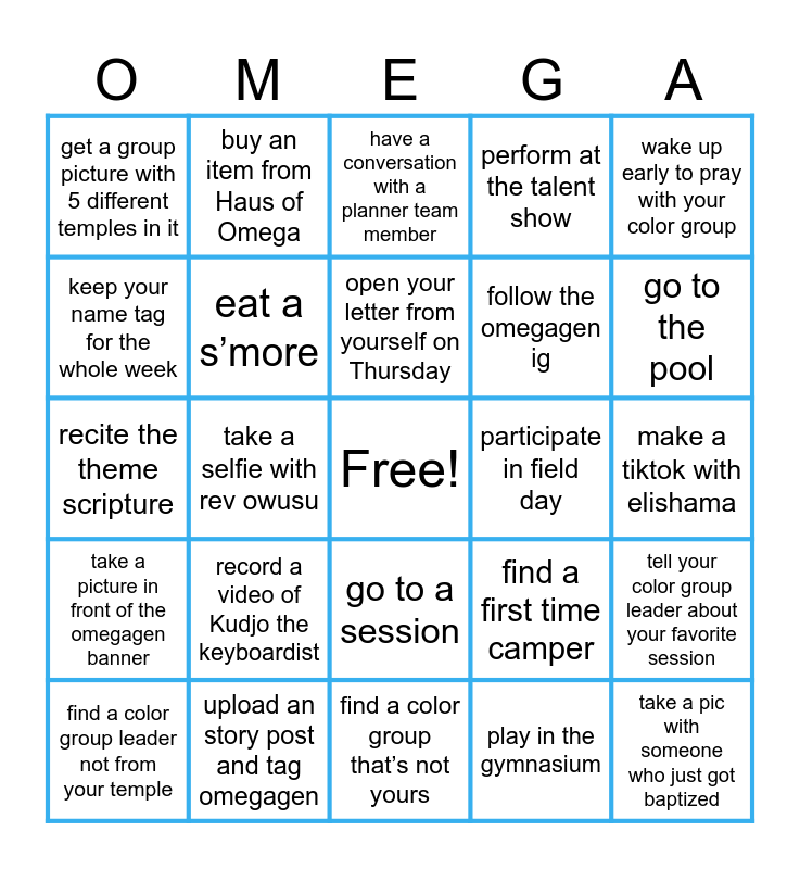 This bingo card has a free space and 29 words: find a color group leader not from your temple, participate in the water field day, take a selfie with rev owusu, wear your t-shirt on TUESDAY, get a group picture with 5 different temples in it, have a conversation with a planner team member, eat a s’more, record a video of Kudjo the keyboardist, participate in field day, upload an story post and tag omegagen, make a tiktok with elishama, take a pic with someone who just got baptized, find a color group that’s not yours, play in the gymnasium, go to the pool, make a video with someone from your temple, go to a session, take a picture in front of the omegagen banner, wake up early to pray with your color group, recite the theme scripture, find a first time camper, Come to the front of the auditorium, follow the omegagen ig, keep your name tag for the whole week, perform at the talent show, buy an item from Haus of Omega, tell your color group leader about your favorite session, open your letter from yourself on Thursday and get a group pic with 10 different people at lunch and dinner.