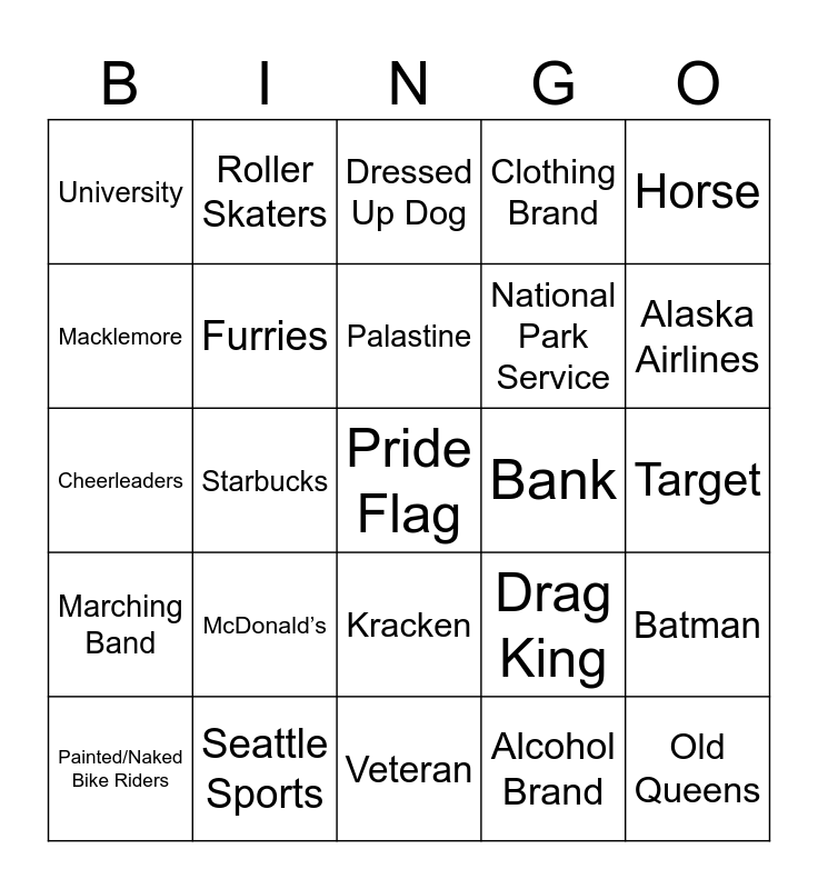 This bingo card has a free space and 29 words: Painted/Naked Bike Riders, Church, Starbucks, Cowboy Hat, University, Dressed Up Dog, Furries, McDonald’s, Bank, Seattle Sports, Target, Old Queens, Veteran, Alcohol Brand, Alaska Airlines, Drag Queen, Kracken, Marching Band, Horse, Cheerleaders, Drag King, Zamboni, National Park Service, Macklemore, Clothing Brand, Roller Skaters, Batman, Palastine and Bill Nye.