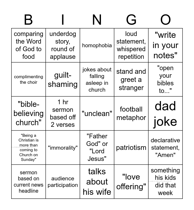 This bingo card has 3 images and 25 words: "immorality", talks about his wife, jokes about falling asleep in church, sermon based on current news headline, "write in your notes", comparing the Word of God to food, complimenting the choir, underdog story, round of applause, football metaphor, "Father God" or "Lord Jesus", stand and greet a stranger, "bible-believing church", patriotism, declarative statement, "Amen", guilt-shaming, something his kids did that week, dad joke, homophobia, "open your bibles to...", 1 hr sermon based off 2 verses, "unclean", audience participation, "Being a Christian is more than coming to Church on Sunday", loud statement, whispered repetition and "love offering".