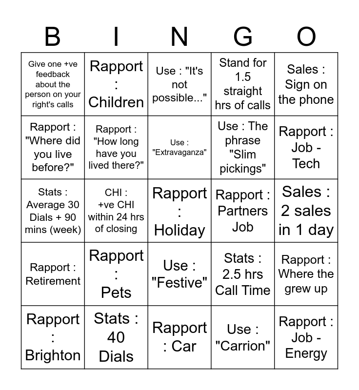 This bingo card has a free space and 24 words: Rapport : Pets, Stats : 40 Dials, Use : "Extravaganza", Rapport : Brighton, Sales : Sign on the phone, Give one +ve feedback about the person on your right's calls, Rapport : "Where did you live before?", Rapport : Children, Rapport : Partners Job, Use : "Festive", Use : The phrase "Slim pickings", Stats : Average 30 Dials + 90 mins (week), Stats : 2.5 hrs Call Time, Rapport : Where the grew up, Rapport : "How long have you lived there?", Use : "Carrion", Sales : 2 sales in 1 day, Use : "It's not possible...", Rapport : Job - Tech, CHI : +ve CHI within 24 hrs of closing, Rapport : Job - Energy, Rapport : Retirement, Stand for 1.5 straight hrs of calls and Rapport : Car.