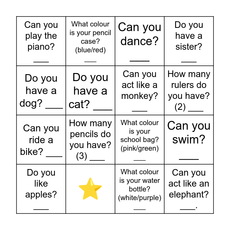This bingo card has 16 words: ⭐️, Can you swim? ___, Can you dance? ___, Can you play the piano? ___, Can you ride a bike? ___, What colour is your pencil case? (blue/red) ___, What colour is your school bag? (pink/green) ___, What colour is your water bottle? (white/purple) ___, Do you have a dog? ___, Do you have a cat? ___, Do you like apples? ___, Do you have a sister? ___, How many pencils do you have? (3) ___, How many rulers do you have? (2) ___, Can you act like a monkey? ___ and Can you act like an elephant? ___..