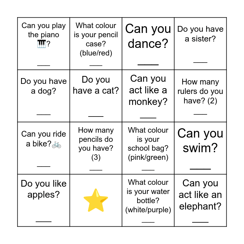 This bingo card has 16 words: ⭐️, Can you swim? ___, Can you dance? ___, Can you play the piano🎹? ___, Can you ride a bike?🚲 ___, What colour is your pencil case? (blue/red) ___, What colour is your school bag? (pink/green) ___, What colour is your water bottle? (white/purple) ___, Do you have a dog? ___, Do you have a cat? ___, Do you like apples? ___, Do you have a sister? ___, How many pencils do you have? (3) ___, How many rulers do you have? (2) ___, Can you act like a monkey? ___ and Can you act like an elephant? ___.