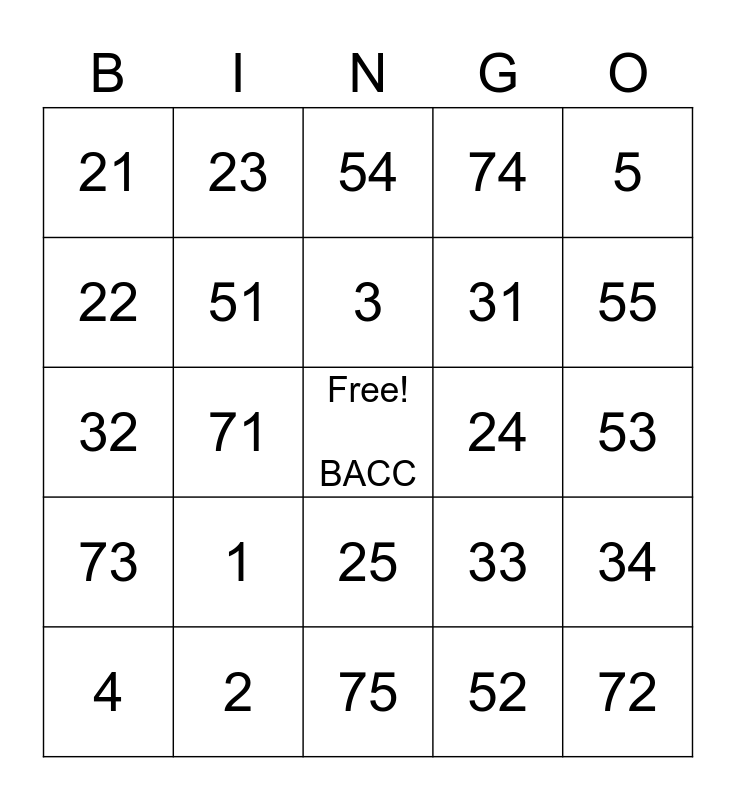 This bingo card has a free space and 24 words: 1, 2, 3, 4, 5, 21, 22, 23, 24, 25, 31, 32, 33, 34, 51, 52, 53, 54, 55, 71, 72, 73, 74 and 75.
