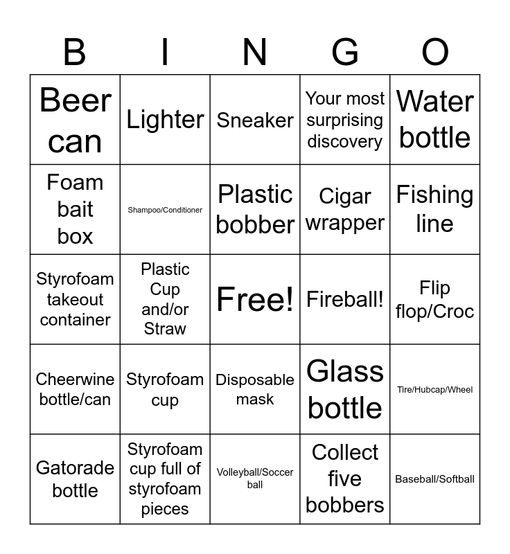 This bingo card has a free space and 25 words: Styrofoam cup, Volleyball/Soccer ball, Plastic bobber, Gatorade bottle, Water bottle, Beer can, Foam bait box, Lighter, Fireball!, Disposable mask, Cigar wrapper, Styrofoam takeout container, Glass bottle, Tire/Hubcap/Wheel, Shampoo/Conditioner, Collect a kitchen bag worth of trash, Flip flop/Croc, Sneaker, Fishing line, Plastic Cup and/or Straw, Baseball/Softball, Styrofoam cup full of styrofoam pieces, Cheerwine bottle/can, Your most surprising discovery and Collect five bobbers.