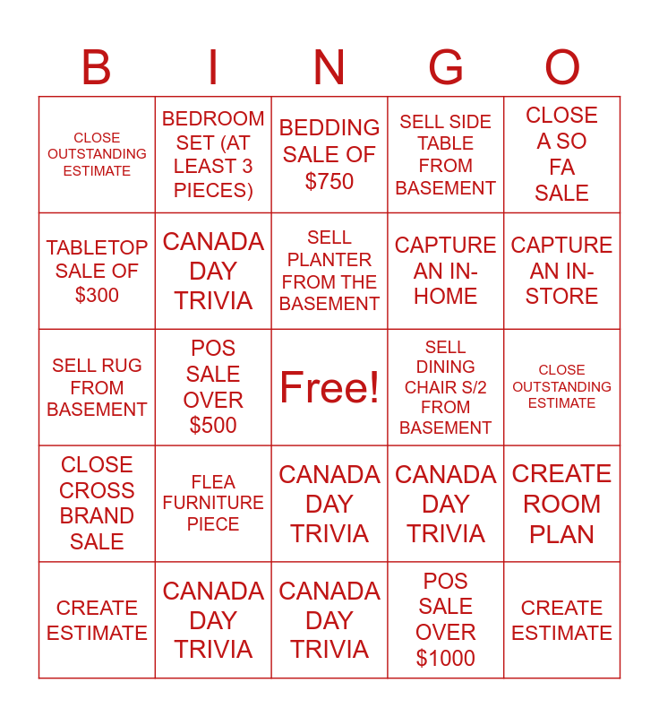 This bingo card has a free space and 25 words: FLEA FURNITURE PIECE, CANADA DAY TRIVIA, SELL PLANTER FROM THE BASEMENT, CREATE ESTIMATE, CLOSE A SOFA SALE, CLOSE OUTSTANDING ESTIMATE, TABLETOP SALE OF $300, BEDROOM SET (AT LEAST 3 PIECES), SELL DINING CHAIR S/2 FROM BASEMENT, CANADA DAY TRIVIA, CAPTURE AN IN-HOME, SELL RUG FROM BASEMENT, CANADA DAY TRIVIA, CREATE ROOM PLAN, CANADA DAY TRIVIA, SELL A PIECE OF OUTDOOR FURNI, CLOSE OUTSTANDING ESTIMATE, BEDDING SALE OF $750, CAPTURE AN IN-STORE, POS SALE OVER $500, CREATE ESTIMATE, CANADA DAY TRIVIA, CLOSE CROSS BRAND SALE, SELL SIDE TABLE FROM BASEMENT and POS SALE OVER $1000.