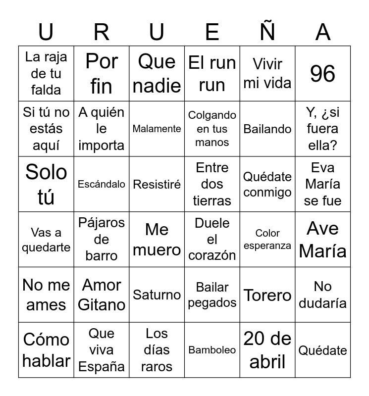 This bingo card has 90 words: Libre, Mediterráneo, Eva María se fue, Cuando zarpa el amor, La Macarena, La bicicleta, Clavaíto, Torero, Me gustas tú, Vivan los novios, Rayando el sol, Vivan España, Que viva España, Resistiré, La chica ye-yé, A quién le importa, Bailar pegados, 20 de abril, La puerta de Alcalá, Fiesta, Corazón partío, La flaca, Color esperanza, Granada, Bailando, Duele el corazón, Mariposa tecknicolor, No dudaría, Lía, Solo tú, Cómo hablar, Pájaros de barro, Insurrección, Entre dos tierras, La raja de tu falda, El run run, Que nadie, Tu enemigo, Y, ¿si fuera ella?, Colgando en tus manos, Me muero, 96, Los días raros, Quédate, Mon amour, Vas a quedarte, Lo malo, Teléfono, Nada sale mal, Despechá, Motomami, Malamente, Se nos rompió el amor, Como una ola, Señora, Qué sabe nadie, Escándalo, Yo soy aquel, Volare, Bamboleo, Amor Gitano, Soy yo, 90 minutos, Vencer al amor, Mi persona favorita, Antes muerta que sencilla, Bulería, Ave María, Lloraré las penas, El alma en pie, Quédate conmigo, Solo tú, Saturno, Solamente tú, Por fin, Si tú no estás aquí, El talismán, A fuego lento, Cómo quieres que te quiera, Algo contigo, No me ames, Vivir mi vida, Valió la pena, Bailando, Salta, Me colé en una fiesta, Hijo de la luna, Mujer contra mujer, Aire and Cruz de navajas.