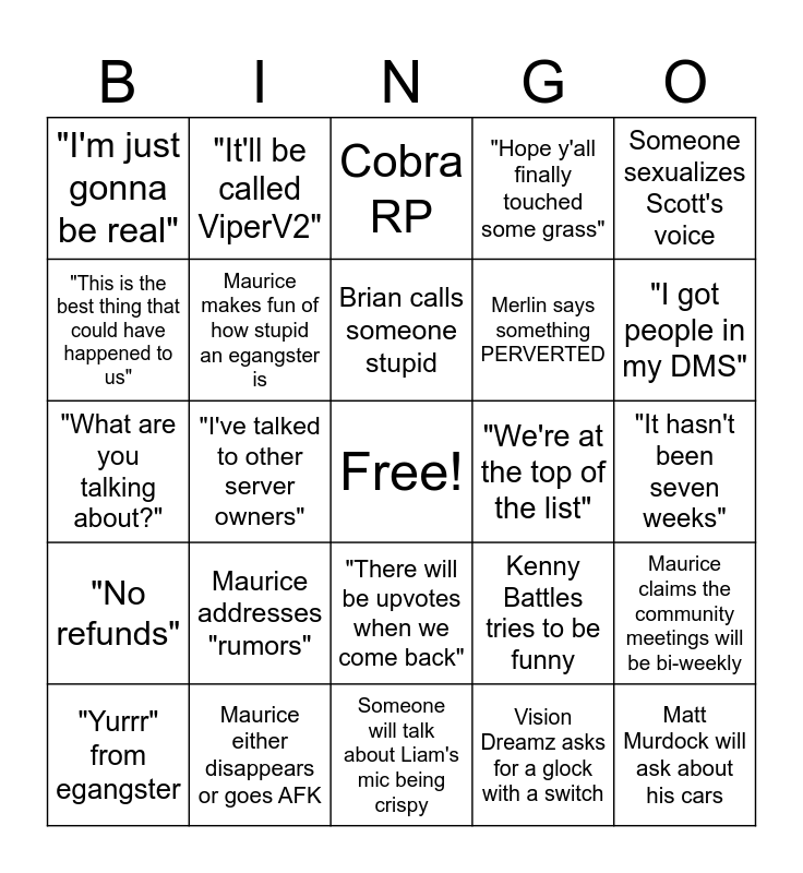 This bingo card has a free space and 24 words: "Yurrr" from egangster, Maurice addresses "rumors", Brian calls someone stupid, Vision Dreamz asks for a glock with a switch, Someone sexualizes Scott's voice, "I'm just gonna be real", "It'll be called ViperV2", Cobra RP, "We're at the top of the list", "It hasn't been seven weeks", "What are you talking about?", Maurice makes fun of how stupid an egangster is, Kenny Battles tries to be funny, Maurice claims the community meetings will be bi-weekly, "This is the best thing that could have happened to us", Maurice either disappears or goes AFK, Someone will talk about Liam's mic being crispy, "Hope y'all finally touched some grass", "I got people in my DMS", "No refunds", "I've talked to other server owners", "There will be upvotes when we come back", Merlin says something PERVERTED and Matt Murdock will ask about his cars.