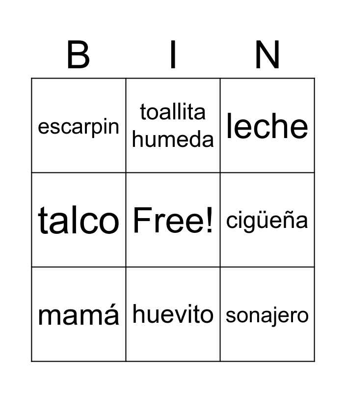 This bingo card has a free space and 30 words: mamadera, chupete, cochecito, babero, escarpin, leche, mamá, papá, bebé, vacuna, gatear, pañal, clinica, gorrito, medias, cuna, diente de leche, juguete, cólico, sonajero, manta, nieto, toallita humeda, papilla, cigüeña, talco, osito de peluche, sillita, huevito and cambiador.