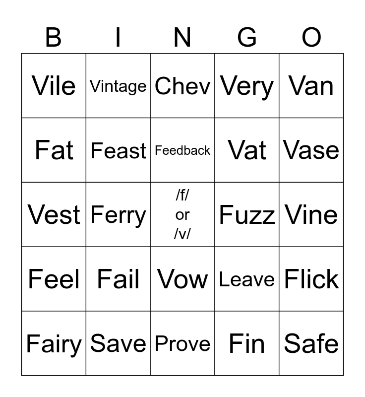 This bingo card has a free space and 64 words: Vocal, Fashion, Valor, Flick, Vex, Fluent, Vintage, Fortune, Feedback, Vanguard, Vow, Fan, Vine, Van, Fine, Fat, Ferry, Vile, Veal, Vat, Fail, Feel, Very, Veil, File, Fast, Vast, Fault, Vault, Fear, Veer, Few, View, Face, Vase, Fairy, Vary, Fin, Vin, Feast, Vest, Fuzz, Buzz, Life, Live, Safe, Save, Leaf, Leave, Strife, Strive, Proof, Prove, Belief, Believe, Chef, Chev, Refuse, Reverse, Roof, Rove, Vial, Flutter and Viper.