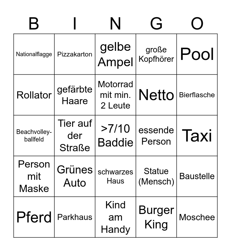 This bingo card has a free space and 24 words: Grünes Auto, Parkhaus, Motorrad mit min. 2 Leute, Pferd, Pool, Nationalflagge, Rollator, Pizzakarton, essende Person, schwarzes Haus, Netto, Beachvolley- ballfeld, Statue (Mensch), Baustelle, gefärbte Haare, Burger King, Taxi, gelbe Ampel, Bierflasche, Tier auf der Straße, Moschee, Person mit Maske, große Kopfhörer and Kind am Handy.