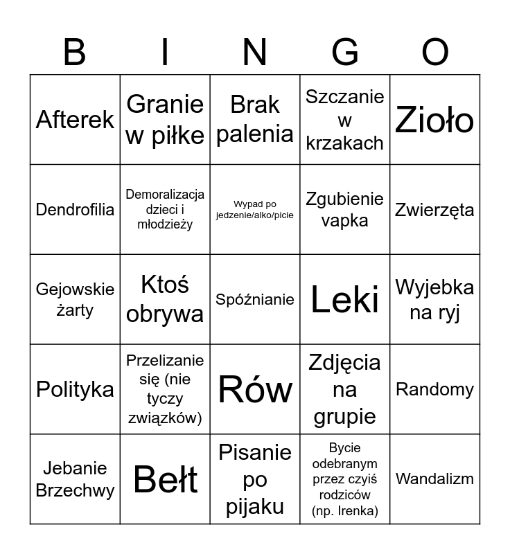 This bingo card has a free space and 24 words: Przelizanie się (nie tyczy związków), Bełt, Wypad po jedzenie/alko/picie, Jebanie Brzechwy, Zioło, Afterek, Dendrofilia, Granie w piłke, Leki, Rów, Zgubienie vapka, Gejowskie żarty, Zdjęcia na grupie, Randomy, Demoralizacja dzieci i młodzieży, Bycie odebranym przez czyiś rodziców (np. Irenka), Wyjebka na ryj, Brak palenia, Zwierzęta, Ktoś obrywa, Wandalizm, Polityka, Szczanie w krzakach and Pisanie po pijaku.