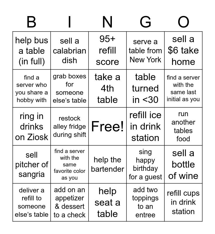 This bingo card has a free space and 24 words: deliver a refill to someone else’s table, find a server with the same favorite color as you, take a 4th table, add two toppings to an entree, sell a $6 take home, help bus a table (in full), sell a calabrian dish, 95+ refill score, refill ice in drink station, run another tables food, ring in drinks on Ziosk, grab boxes for someone else’s table, sing happy birthday for a guest, sell a bottle of wine, find a server who you share a hobby with, add on an appetizer & dessert to a check, help seat a table, serve a table from New York, find a server with the same last initial as you, sell pitcher of sangria, restock alley fridge during shift, help the bartender, table turned in <30 and refill cups in drink station.