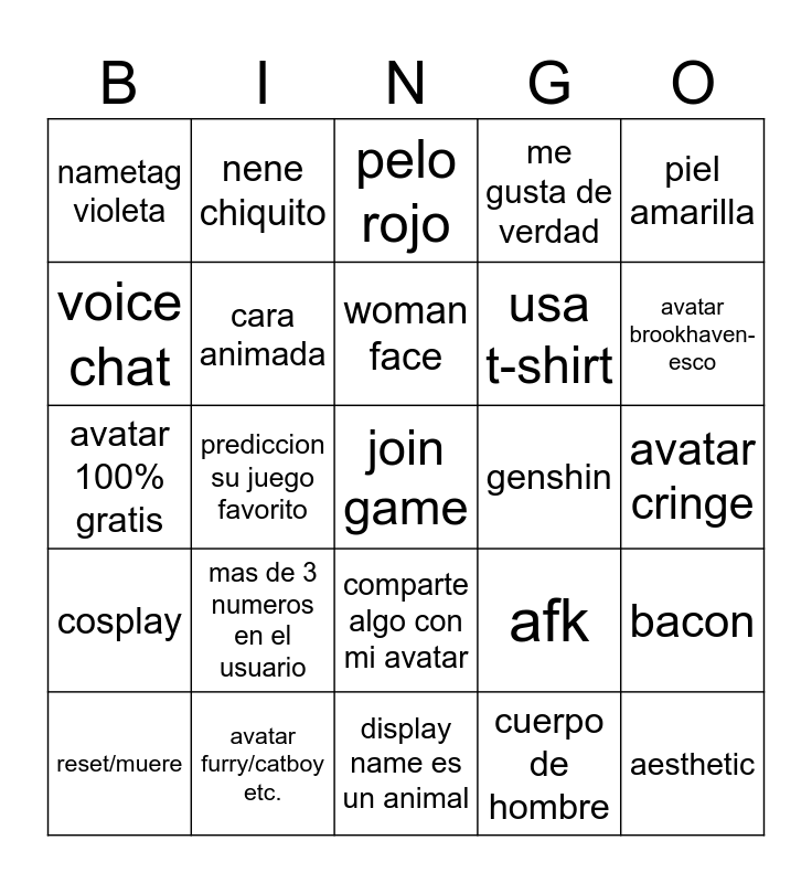 This bingo card has a free space and 24 words: mas de 3 numeros en el usuario, avatar furry/catboy etc., woman face, reset/muere, piel amarilla, nametag violeta, voice chat, nene chiquito, genshin, comparte algo con mi avatar, usa t-shirt, avatar 100% gratis, afk, bacon, cara animada, cuerpo de hombre, avatar cringe, pelo rojo, avatar brookhaven-esco, prediccion su juego favorito, aesthetic, cosplay, me gusta de verdad and display name es un animal.