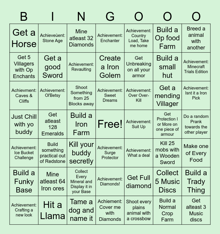 This bingo card has a free space and 48 words: Get Full diamond, Build a small hut, Achiement: Cover me with Diamonds, Get atleast 128 Emeralds, Shoot Something from 25 Blocks away, Do a random Prank towards the other player, Achieveùent: Stone Age, Hit a Llama, Build a Op food Farm, Achievement: Surge Protector, Breed a animal with another, Achievement: Enchanter, Get a mending Villager, Achievement: Over Over-Kill, Build a Funky Base, Get Protection I or More on one piece of armour, Get 5 Villagers with Op Enchants, Achievement: Minecraft Trials Edition, Collect 5 Music Discs, Achievement: Country Load, Take me home, Get Unbreaking on all your armor, Build a Iron Farm, Get a Horse, Get a good Sword, Build a Trady Thing, Achievement: Revaulting, Achievement: Isnt it a Iron Pick, Achievement: Crafting a new look, Achievement: Sweet Dreams, Achievement: Ol'Betsy, Build a Normal Crop Farm, Achievement: Suit Up, Make one of Every Food, Mine atleast 64 Iron ores, Just Chill with yo buddy, Achievement: What a deal, Kill 25 mobs with a Wooden Sword, Achievment: Caves & Cliffs, Kill your buddy secretly, Collect Every Mineral and Display it in your Base, Achievement: Ice Bucket Challenge, Get alteast 3 Music discs, Mine atleast 32 Diamonds, Tame a dog and name it, Create a Iron Golem, Achievement: Diamonds!, Build something practical out of Redstone and Shoot every plains animal with a crossbow.