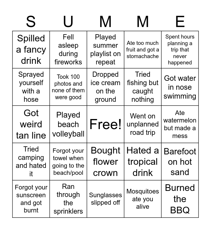 This bingo card has a free space and 24 words: Forgot your sunscreen and got burnt, Forgot your towel when going to the beach/pool, Dropped ice cream on the ground, Mosquitoes ate you alive, Spent hours planning a trip that never happened, Spilled a fancy drink, Fell asleep during fireworks, Played summer playlist on repeat, Went on unplanned road trip, Ate watermelon but made a mess, Got weird tan line, Took 100 photos and none of them were good, Hated a tropical drink, Barefoot on hot sand, Sprayed yourself with a hose, Ran through the sprinklers, Sunglasses slipped off, Ate too much fruit and got a stomachache, Got water in nose swimming, Tried camping and hated it, Played beach volleyball, Bought flower crown, Tried fishing but caught nothing and Burned the BBQ.