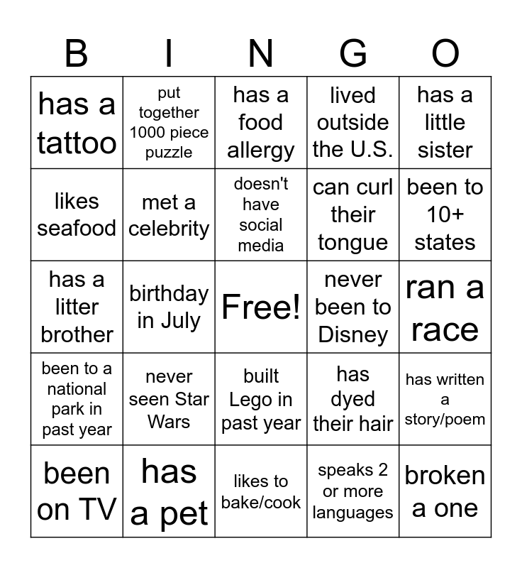 This bingo card has a free space and 29 words: been on TV, been to 3 continents, birthday in July, Plays an instrument, has a tattoo, has a food allergy, met a celebrity, never seen Star Wars, never been to Disney, has a pet, ran a race, broken a one, likes to bake/cook, speaks 2 or more languages, been to 10+ states, can do a cartwheel, built Lego in past year, been to a national park in past year, has a little sister, has a litter brother, has dyed their hair, has been in a parade, can curl their tongue, likes seafood, lived outside the U.S., put together 1000 piece puzzle, has written a story/poem, doesn't have social media and has been in military.