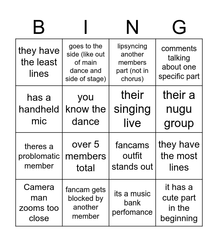 This bingo card has 16 words: Camera man zooms too close, fancam gets blocked by another member, lipsyncing another members part (not in chorus), comments talking about one specific part, has a handheld mic, goes to the side (like out of main dance and side of stage), fancams outfit stands out, they have the most lines, they have the least lines, you know the dance, its a music bank perfomance, their a nugu group, theres a problomatic member, over 5 members total, their singing live and it has a cute part in the beginning.