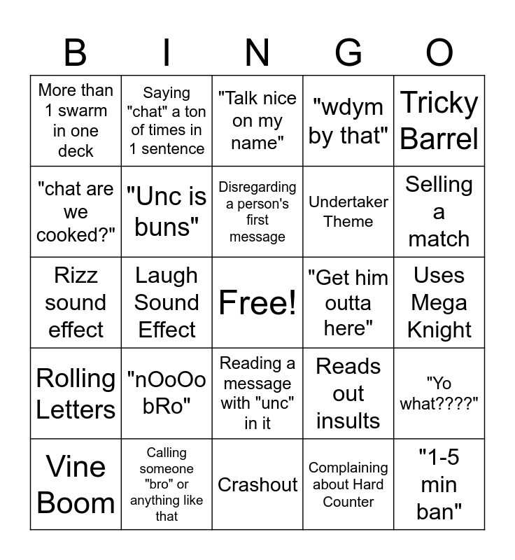 This bingo card has a free space and 24 words: "nOoOo bRo", Calling someone "bro" or anything like that, Disregarding a person's first message, Vine Boom, Tricky Barrel, More than 1 swarm in one deck, "chat are we cooked?", Saying "chat" a ton of times in 1 sentence, "Get him outta here", Reading a message with "unc" in it, Undertaker Theme, Rizz sound effect, Reads out insults, "Yo what????", "Unc is buns", Complaining about Hard Counter, Uses Mega Knight, "Talk nice on my name", Selling a match, Laugh Sound Effect, "1-5 min ban", Rolling Letters, "wdym by that" and Crashout.