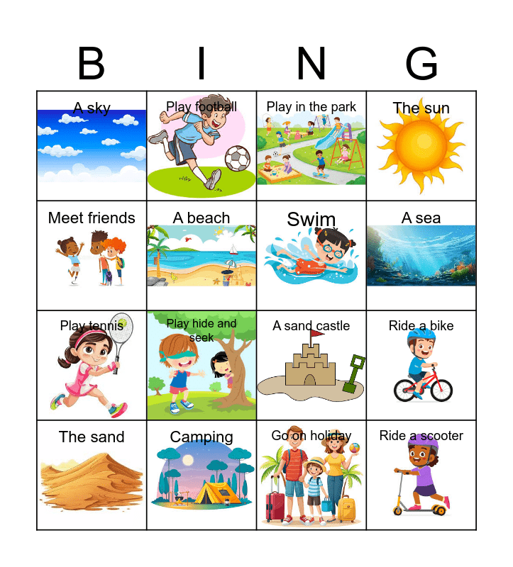 This bingo card has 16 images and 16 words: Camping, Ride a bike, Play in the park, A sky, Play tennis, Play football, A sand castle, Go on holiday, Meet friends, A beach, The sand, The sun, Play hide and seek, A sea, Swim and Ride a scooter.