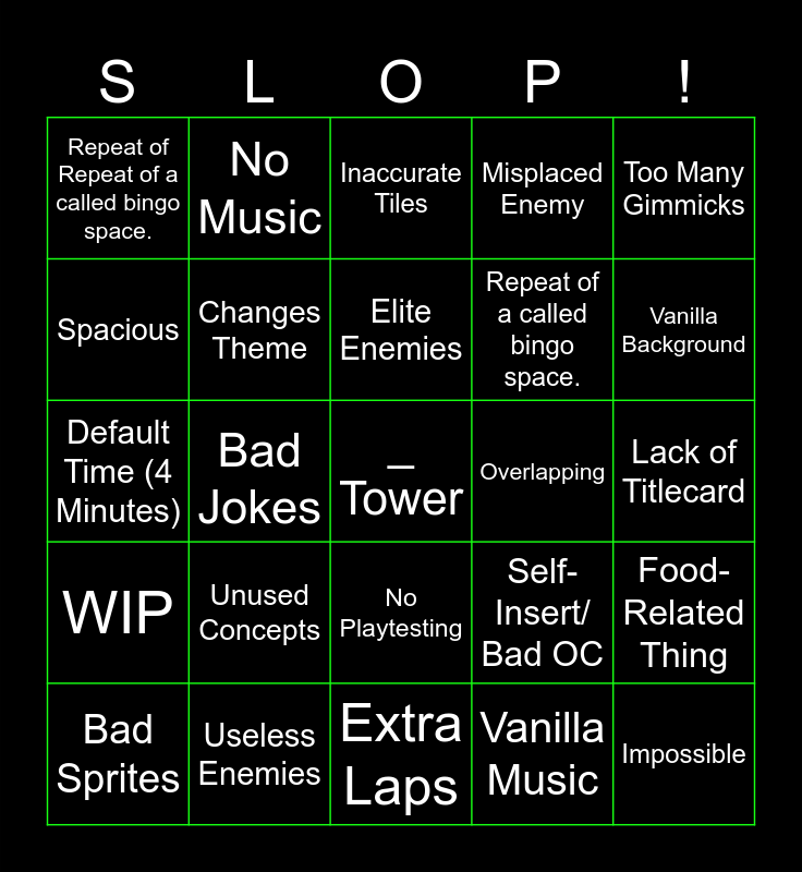This bingo card has a free space and 24 words: Unused Concepts, Useless Enemies, Elite Enemies, Bad Sprites, Too Many Gimmicks, Repeat of Repeat of a called bingo space., Spacious, No Music, Overlapping, No Playtesting, Repeat of a called bingo space., Default Time (4 Minutes), Self-Insert/ Bad OC, Food-Related Thing, Changes Theme, Vanilla Music, Lack of Titlecard, Inaccurate Tiles, Vanilla Background, Bad Jokes, Impossible, WIP, Misplaced Enemy and Extra Laps.