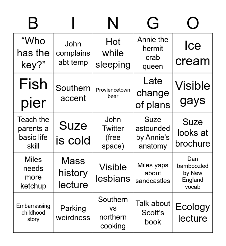 This bingo card has a free space and 49 words: Geology lecture, Ecology lecture, Arnolds, Southern vs northern cooking, Mass history lecture, Suze hot flash, John complains abt temp, Talking about Mexico, Fish pier, Fish n chips, Southern accent, Annie the hermit crab queen, Dan bamboozled by New England vocab, Miles yaps about sandcastles, Make PB&J but don’t eat it, Catch a crab, Proviencetown bear, Suze astounded by Annie’s anatomy, John pee break, Ice cream, Suze is cold, Talk about Scott’s book, “Who has the key?”, Late change of plans, Graphic design lecture, Visible gays, Embarrassing childhood story, Card game, Visible lesbians, Miles needs more ketchup, Public heath lecture, Disordered eating, Boogie boarding, Catholic schoolgirl syndrome, Parking weirdness, Unknown gender passerby, Suzeranity, Johnerosity, Suze looks at brochure, Civil engineering lecture, Use washer and dryer, Suze attack, John quits, Unusual food item, Teach the parents a basic life skill, Hot while sleeping, Travel 1000 miles to watch TV, Annie & Dan whisper libidinously and Smoke weed.
