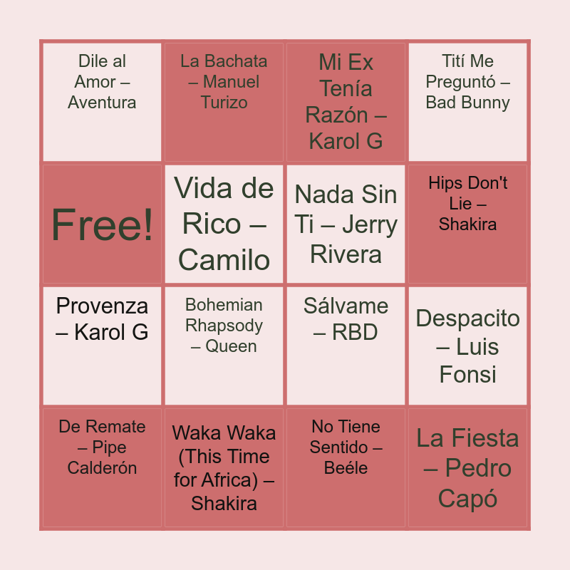 This bingo card has 16 words: Waka Waka (This Time for Africa) – Shakira, Despacito – Luis Fonsi, Mi Ex Tenía Razón – Karol G, Dile al Amor – Aventura, Provenza – Karol G, La Bachata – Manuel Turizo, Sálvame – RBD, No Tiene Sentido – Beéle, Free!, Vida de Rico – Camilo, De Remate – Pipe Calderón, Tití Me Preguntó – Bad Bunny, Bohemian Rhapsody – Queen, Hips Don't Lie – Shakira, Nada Sin Ti – Jerry Rivera and La Fiesta – Pedro Capó.