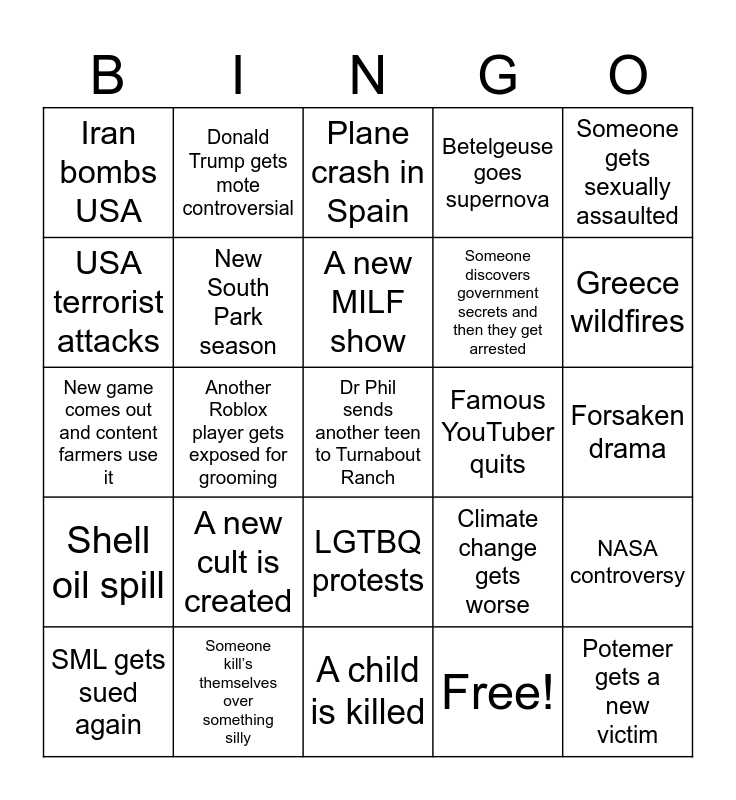 This bingo card has 30 words: Someone kill’s themselves over something silly, A new serial killer, Another Roblox player gets exposed for grooming, WW3 starts, Iran bombs USA, Plane crash in Spain, New South Park season, LGTBQ protests, Famous YouTuber quits, A child is killed, Forsaken drama, Dr Phil sends another teen to Turnabout Ranch, Free!, Potemer gets a new victim, Greece wildfires, More BFDIA/TPOT episodes, Climate change gets worse, Shell oil spill, A new cult is created, Someone gets sexually assaulted, New game comes out and content farmers use it, North Korea executes a new person, Donald Trump gets mote controversial, Someone discovers government secrets and then they get arrested, USA terrorist attacks, Betelgeuse goes supernova, NASA controversy, SML gets sued again, A new MILF show and Seth McFarlainre gets exposed.