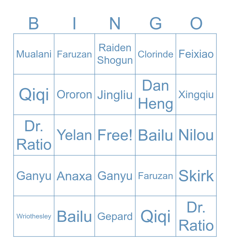 This bingo card has a free space and 90 words: Skirk, Shenhe, Ganyu, Mualani, Clorinde, Raiden Shogun, Ororon, Yelan, Xingqiu, Wriothesley, Qiqi, Chongyun, Sigewinn, Nilou, Faruzan, Jingliu, Cipher, Acheron, Anaxa, Castorice, Dan Heng, Sunday, Gepard, Aventurine, Dr. Ratio, Bailu, Bronya, Seele, Silver Wolf, Feixiao, Feixiao, Skirk, Shenhe, Ganyu, Mualani, Clorinde, Raiden Shogun, Ororon, Yelan, Xingqiu, Wriothesley, Qiqi, Chongyun, Sigewinn, Nilou, Faruzan, Jingliu, Cipher, Acheron, Anaxa, Castorice, Dan Heng, Sunday, Gepard, Aventurine, Dr. Ratio, Bailu, Bronya, Seele, Silver Wolf, Mualani, Shenhe, Bailu, Gepard, Yelan, Skirk, Xingqiu, Qiqi, Seele, Sunday, Anaxa, Dr. Ratio, Jingliu, Aventurine, Faruzan, Ororon, Sigewinne, Chongyun, Acheron, Dan Heng, Nilou, Feixiao, Castorice, Wriothesley, Clorinde, Bronya, Raiden Shogun, Ganyu, Cipher and Silver Wolf.