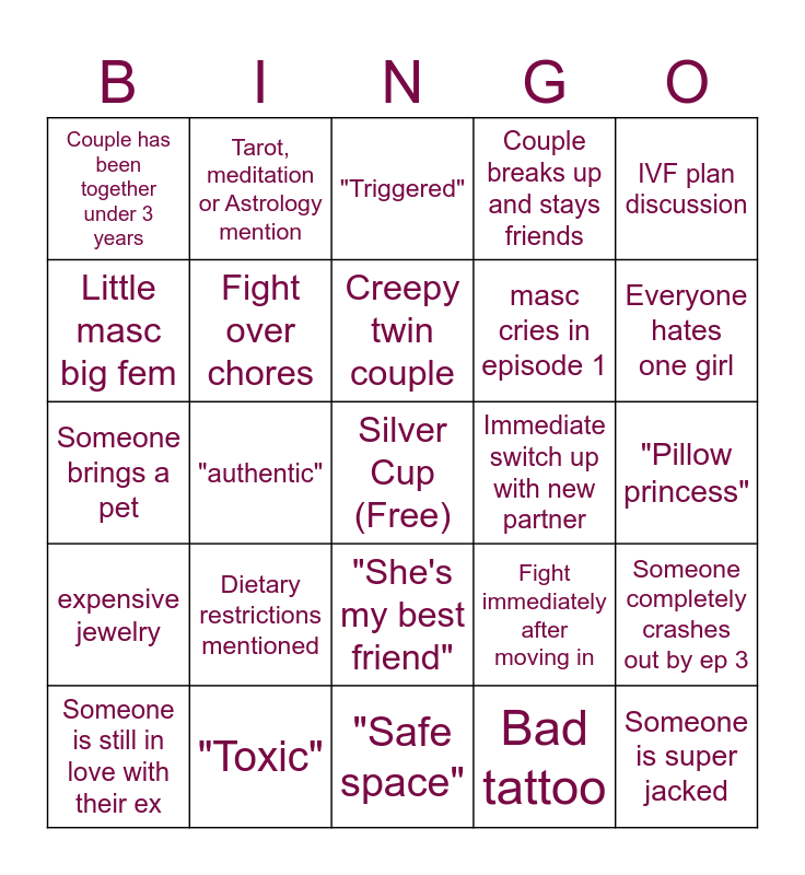 This bingo card has a free space and 24 words: Dietary restrictions mentioned, "Toxic", Creepy twin couple, Someone is still in love with their ex, IVF plan discussion, Couple has been together under 3 years, Little masc big fem, Tarot, meditation or Astrology mention, Immediate switch up with new partner, "She's my best friend", masc cries in episode 1, Someone brings a pet, Fight immediately after moving in, Someone completely crashes out by ep 3, Fight over chores, Bad tattoo, "Pillow princess", "Triggered", Everyone hates one girl, "authentic", Someone is super jacked, expensive jewelry, Couple breaks up and stays friends and "Safe space".
