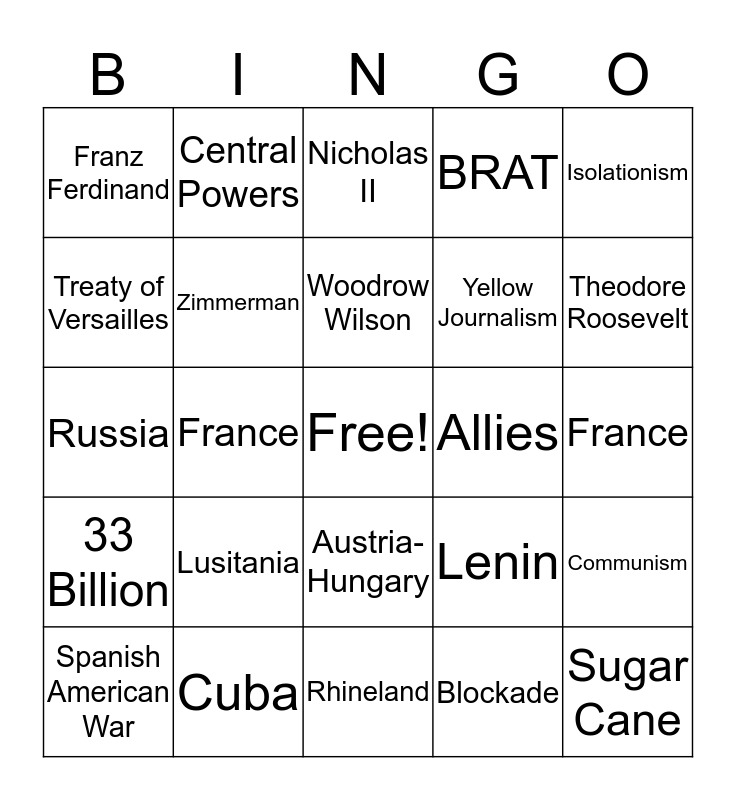 This bingo card has a free space and 24 words: Lusitania, Cuba, Woodrow Wilson, Spanish American War, Isolationism, Franz Ferdinand, Treaty of Versailles, Central Powers, Allies, Austria-Hungary, Yellow Journalism, Russia, Lenin, Communism, Zimmerman, Blockade, France, Nicholas II, Theodore Roosevelt, France, Sugar Cane, 33 Billion, BRAT and Rhineland.