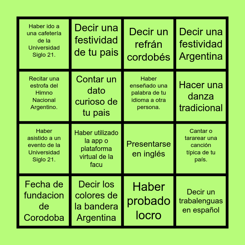 This bingo card has 19 words: Presentarse en inglés, Saludar en 3 idiomas distintos, Decir un refrán cordobés, Decir un trabalenguas en español, Cantar o tararear una canción típica de tu país., Recitar una estrofa del Himno Nacional Argentino., Haber probado locro, Haber ido a una cafetería de la Universidad Siglo 21., Decir una festividad de tu pais, Haber asistido a un evento de la Universidad Siglo 21., Haber utilizado la app o plataforma virtual de la facu, Contar un dato curioso de tu pais, Haber enseñado una palabra de tu idioma a otra persona., Decir los colores de la bandera Argentina, Fecha de fundacion de Corodoba, Decir un dato historico de Corodba, Decir una festividad Argentina, Hacer una danza tradicional and Contar un dato curioso de tu pais.