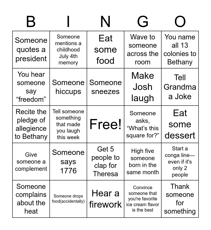 This bingo card has a free space and 24 words: Someone says 1776, Someone drops food(accidentally), Someone sneezes, Someone complains about the heat, You name all 13 colonies to Bethany, Someone quotes a president, You hear someone say “freedom”, Someone mentions a childhood July 4th memory, Someone asks, “What’s this square for?”, Get 5 people to clap for Theresa, Make Josh laugh, Recite the pledge of allegience to Bethany, High five someone born in the same month, Start a conga line—even if it's only 2 people, Someone hiccups, Convince someone that you're favorite ice cream flavor is the best, Eat some dessert, Eat some food, Tell Grandma a Joke, Tell someone something that made you laugh this week, Thank someone for something, Give someone a complement, Wave to someone across the room and Hear a firework.