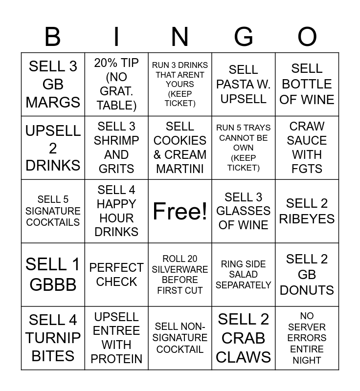 This bingo card has a free space and 24 words: PERFECT CHECK, UPSELL ENTREE WITH PROTEIN, SELL COOKIES & CREAM MARTINI, SELL 4 TURNIP BITES, SELL BOTTLE OF WINE, SELL 3 GB MARGS, UPSELL 2 DRINKS, 20% TIP (NO GRAT. TABLE), SELL 3 GLASSES OF WINE, ROLL 20 SILVERWARE BEFORE FIRST CUT, RUN 5 TRAYS CANNOT BE OWN (KEEP TICKET), SELL 5 SIGNATURE COCKTAILS, RING SIDE SALAD SEPARATELY, SELL 2 GB DONUTS, SELL 3 SHRIMP AND GRITS, SELL 2 CRAB CLAWS, SELL 2 RIBEYES, RUN 3 DRINKS THAT ARENT YOURS (KEEP TICKET), CRAW SAUCE WITH FGTS, SELL 4 HAPPY HOUR DRINKS, NO SERVER ERRORS ENTIRE NIGHT, SELL 1 GBBB, SELL PASTA W. UPSELL and SELL NON-SIGNATURE COCKTAIL.