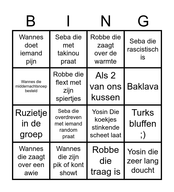 This bingo card has 16 words: Wannes die zijn pik of kont showt, Turks bluffen ;), Robbe die zaagt over de warmte, Wannes doet iemand pijn, Ruzietje in de groep, Seba die met takinou praat, Yosin Die koekjes stinkende scheet laat, Robbe die traag is, Wannes die middernachtsnoep besteld, Robbe die flext met zijn spiertjes, Wannes die zaagt over een awie, Seba die rascistisch is, Seba die overdreven met iemand random praat, Baklava, Als 2 van ons kussen and Yosin die zeer lang doucht.